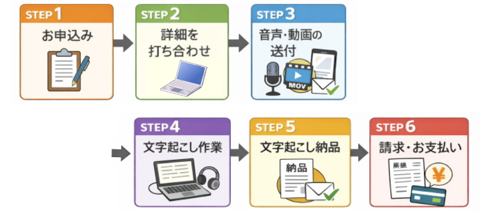 そこで本ページでは、当方に文字起こしを依頼してから納品・支払までの流れを、各ステップごとにわかりやすくご案内いたします。