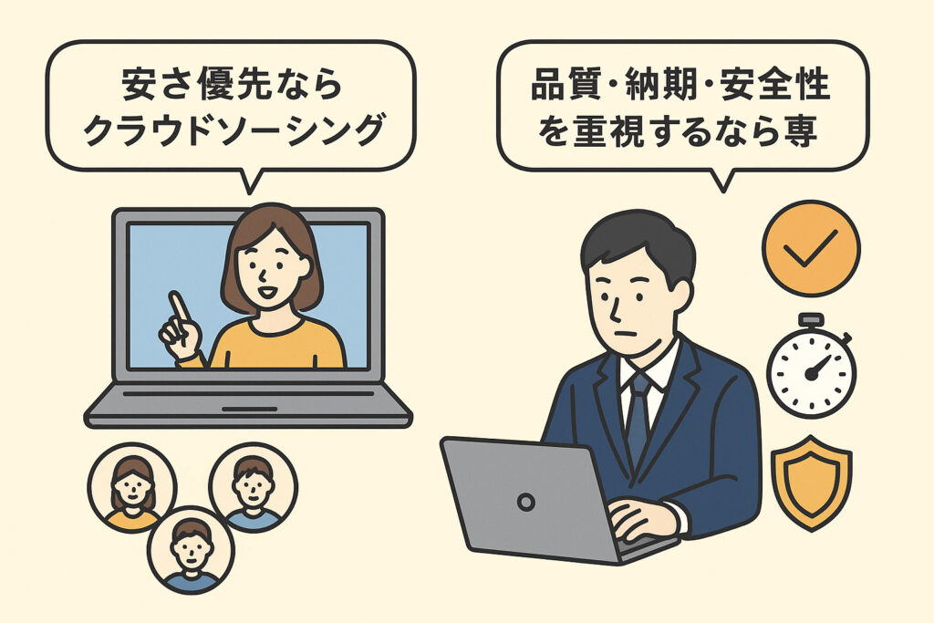 文字起こしの外注先を探しているときに、「クラウドソーシング」と「専門業者」のどちらを選んだらよいか迷う方は多いはずです。